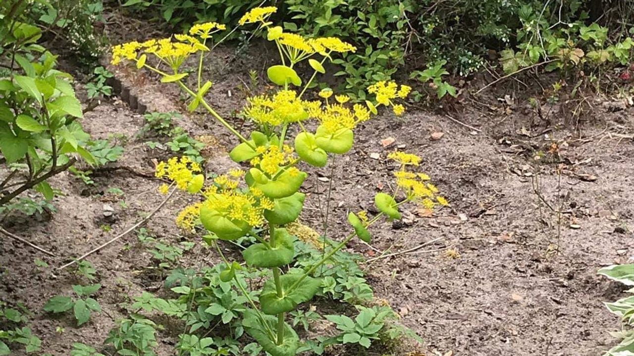Op de bovenstaande foto zie je in het midden een groengele plant met een scherm van gele bloemen. We hebben hier te maken met een plant uit de schermbloemfamilie, waartoe ook fluitenkruid en de engelwortel behoren. In dit geval is het geen plant van Nederlandse bodem, maar een plant die oorspronkelijk in het oostelijke gebied van de Middellandse Zee. De naam van deze plant is doorwaskervel. Dit is dus een exoot, die na 1900 steeds meer is gaan verwilderen. Deze plant wordt ook vaak aangeplant in tuinen en kan in de buurt van die tuin naar andere tuinen overgaan. Doorwaskervel is een kervelsoort en volgens de geleerden goed eetbaar. De smaak van deze plant is te vergelijken met die van gewone kervel. De plant komt steeds vaker voor in permacultuurtuinen. Een permacultuursysteem wordt zo ontworpen dat het de veerkracht heeft van een natuurlijk ecosysteem. Overigens zijn alle delen van de doorwaskervelplant eetbaar. De planten staan het best op een plek in de schaduw.