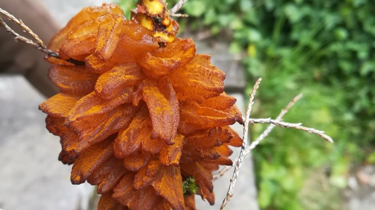 Op de foto hierboven zie je aan een takje een geleiachtige oranjebruine substantie in de vorm van smalle bruine blaadjes. We hebben hier te maken met het vruchtlichaam van een schimmel die de mooie naam jeneverbes-perenroest draagt. Deze hoort bij de vele roesten die we in Nederland kennen en zijn dus organismen die vallen onder het rijk van de schimmels. Deze jeneverbes-perenroest heeft om zijn levenscyclus te voltooien twee heel verschillende waardplanten nodig. De schimmels overwinteren vooral op jeneverbesstruiken, maar we vinden ze tegenwoordig ook af en toe op andere coniferen. Op zo’n jeneverbesstruik ontwikkelt in de lente een vruchtlichaam van die jeneverbes-perenroest. In dit mooi gevormde vruchtlichaam worden de sporen gevormd. Deze sporen worden door de wind meegenomen. Als ze dan op een perenblad landen, veroorzaken ze daar oranje tot rode ronde vlekken. Aan de onderkant van die vlekken ontstaan weer vruchtlichamen. Deze vruchtlichamen ontwikkelen ook sporen die op hun beurt weer via de wind op een jeneverbes of soortgelijke struik kunnen landen en die deze struiken weer aantast. Zo is de cyclus weer rond.