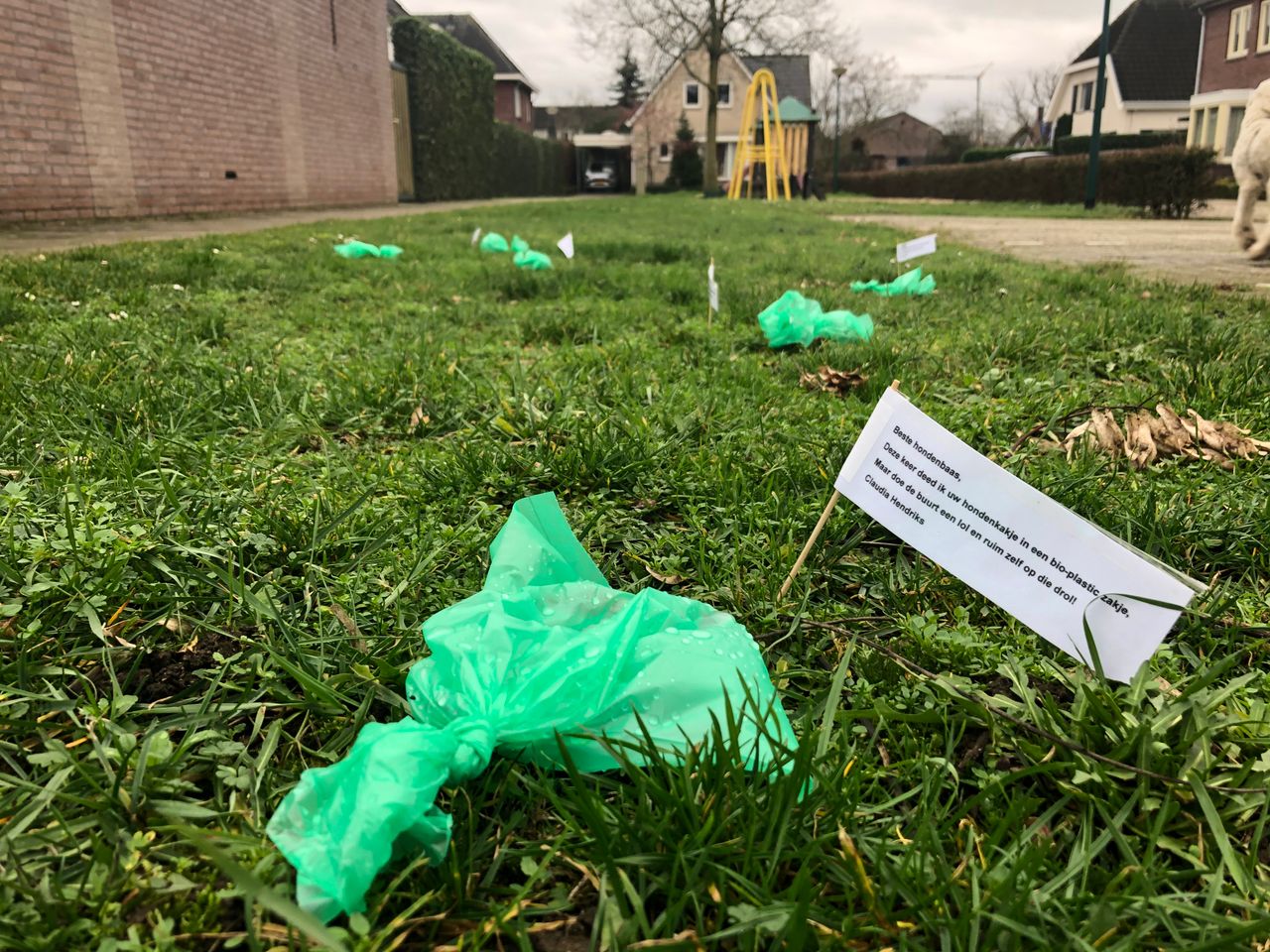 Het zakje laat ze daarna liggen. Claudia legt uit: "Ik ruim het niet op hoor! Dat mag de eigenaar zelf doen. Maar zo weet hij die de drol hier ligt. Ik hoop iedereen zo bewust te maken van het hondenpoep probleem."