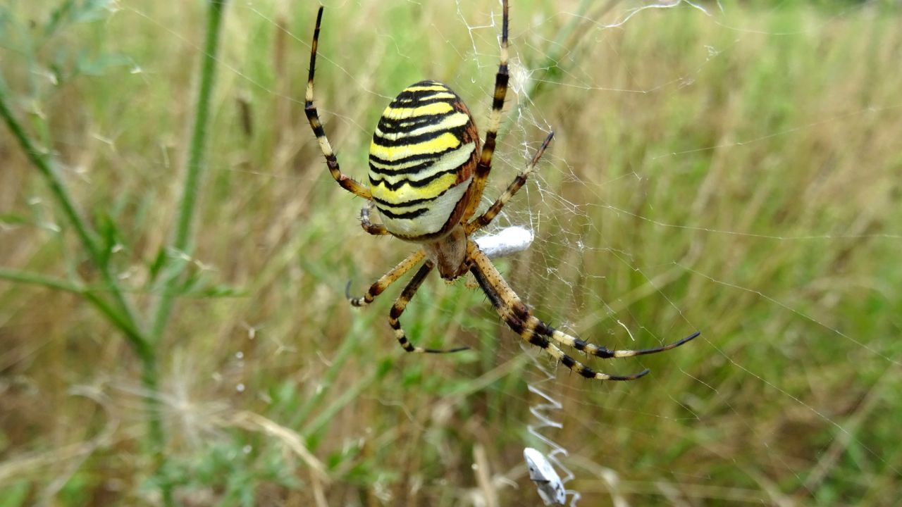 Op de bovenstaande foto zie je een grote spin met zwarte en gele banden. We hebben hier te maken met het vrouwtje van de wespspin. Loes Westgeest gebruikt de naam tijgerspin. Die komt vaker voor, maar de officiële naam van de spin is wespspin. Oorspronkelijk kwam deze wespspin voor in gebieden rond de Middellandse Zee. Wespspinnen zijn als gevolg van de klimaatverandering opgerukt naar het noorden. In 1980 werden deze insecten voor het eerst gezien in Nederland, in de provincie Limburg. Loes vraagt zich af wat het nut is van het bijzondere zigzagweefsel in het web van deze spin? Onderzoekers zijn met deze vraag nog steeds bezig. De vraag is of de witte banden insecten extra aantrekken door uv-licht te weerkaatsen. Of is dit om het web zichtbaarder te maken voor grotere dieren, die het vermijden en niet kapot maken? Of om het web steviger te maken en dus grotere prooien te kunnen vangen? Ik ben benieuwd...