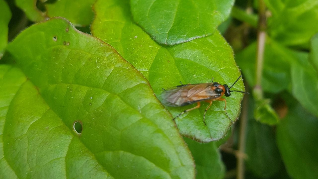 Op de foto hierboven zie je een insect met gele poten, zwarte vlekken, een zwarte kop, zwarte voelsprieten en een lichaam waar door de vleugels heen een rode kleur te zien is. Maaike van Boxtel dacht dat dit een vlieg was, maar dat is het zeker niet. Volgens mij is dit een bladwesp. Bladwespen horen bij de vliesvleugeligen - zoals wespen - maar hebben een bredere verbinding tussen het achterlijf en het borststuk. Ze hebben dus duidelijk geen wespentaille. Daarnaast hebben ze larven die heel erg lijken op rupsen van vlinders. We noemen deze larven dan ook bastaardrupsen. Bladwespen worden soms weleens 'zaagwespen' genoemd. Dit omdat de legboor van de bladwespen op een zaag lijkt. Met deze legboor maken de vrouwtjes gaten in planten en zetten daarin dan hun eitjes af. Binnen de vliesvleugeligen zijn de bladwespen de meest primitieve soort, ze gaan terug tot 200 miljoen jaar.