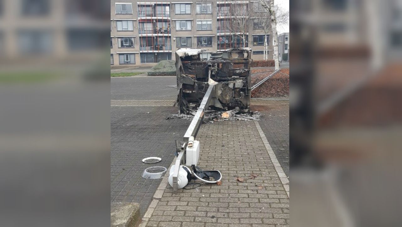 Op het Groenendijkplein is nog duidelijk de brandplek te zien waar de omgetrokken camerapaal in brand heeft gestaan. Volgens de gemeente lopen de kosten richting de twee ton. "Als je de daders hebt, gewoon op hen verhalen. Voor dat geld heb je hier in de wijk ook een extra wijkagent."