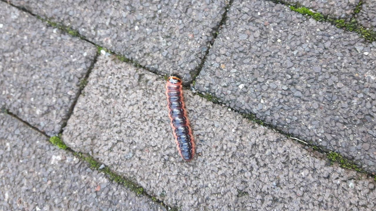 Op de foto zie je op de stenen een glimmend donkerrode rups met een zwarte kop. We hebben hier te maken met een wilgenhoutrups. Deze rupsen kunnen gemakkelijk 9 tot 10 cm groot worden. Vrouwtjes van de wilgenhoutrupsen leggen met hun legboren eitjes in een spleet van de schors van een loofboom. Daarna knagen zich de rupsen gedurende meestal 2 jaar gangen in die boom. Deze geknaagde gangen kunnen meters lang worden. Na 2 jaar zijn de rupsen volgroeit en knagen ze in die loofboom een grote poppenkamer. Van het zaagsel samen met gesponnen zijdedraden maken ze cocoonen. Hierin verpoppen de wilgehoutrupsen zich en komen na een overwintering in het voorjaar uit. Pak ze nooit op, want dan voelen ze zich bedreigd en scheiden ze onmiddellijk een geur af, die ruikt na azijnzuur en sommige mensen zeggen zelf een geur van een bok in paringstijd.