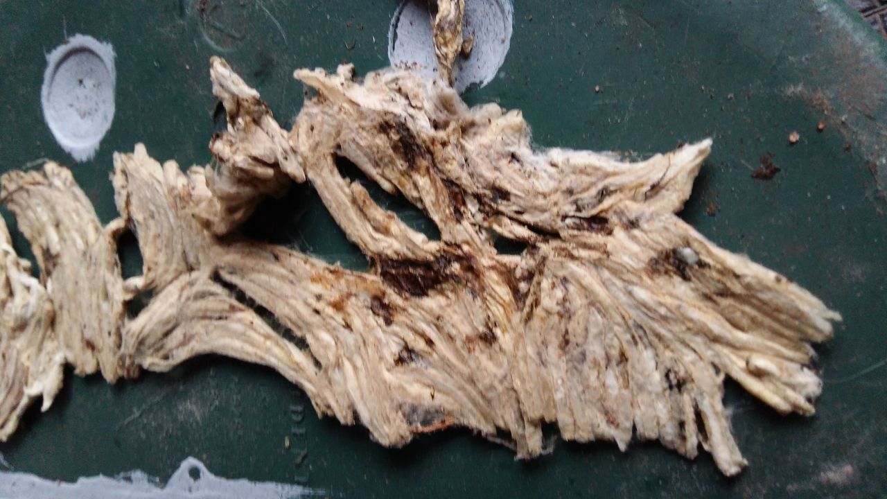 Op de foto hierboven zie een warrige lichtbruine substantie. Annie Giebelen wil weten wat dit is. Ze schrijft dat het net draden zijn. Wel, dat zijn het ook. Ik denk dat het zwamdraden zijn. We hebben hier te maken met een stukje echte schimmel of zwam. Uit deze vlok zou dus een vruchtlichaam - de paddenstoel - kunnen groeien. Later, na het weghalen van deze zwamvlok, zag ze witte maden op die plek kruipen. Dat kan, omdat die diertjes de zwamvlok gebruiken als schuilplaats.