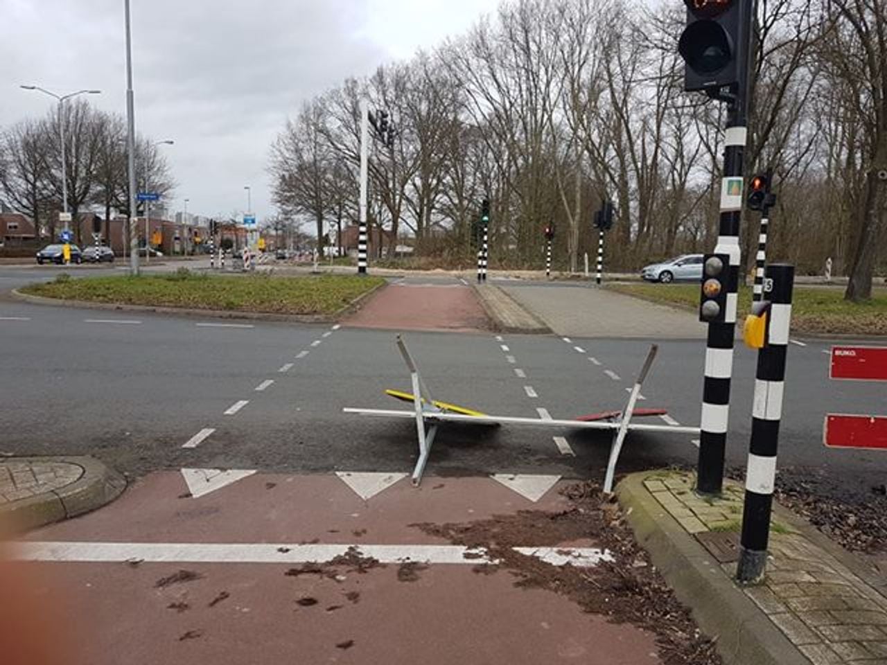 12.38 op de Tempellaan in Eindhoven is een versperringsbord op de weg gewaaid. Foto: Hans van Boogaard