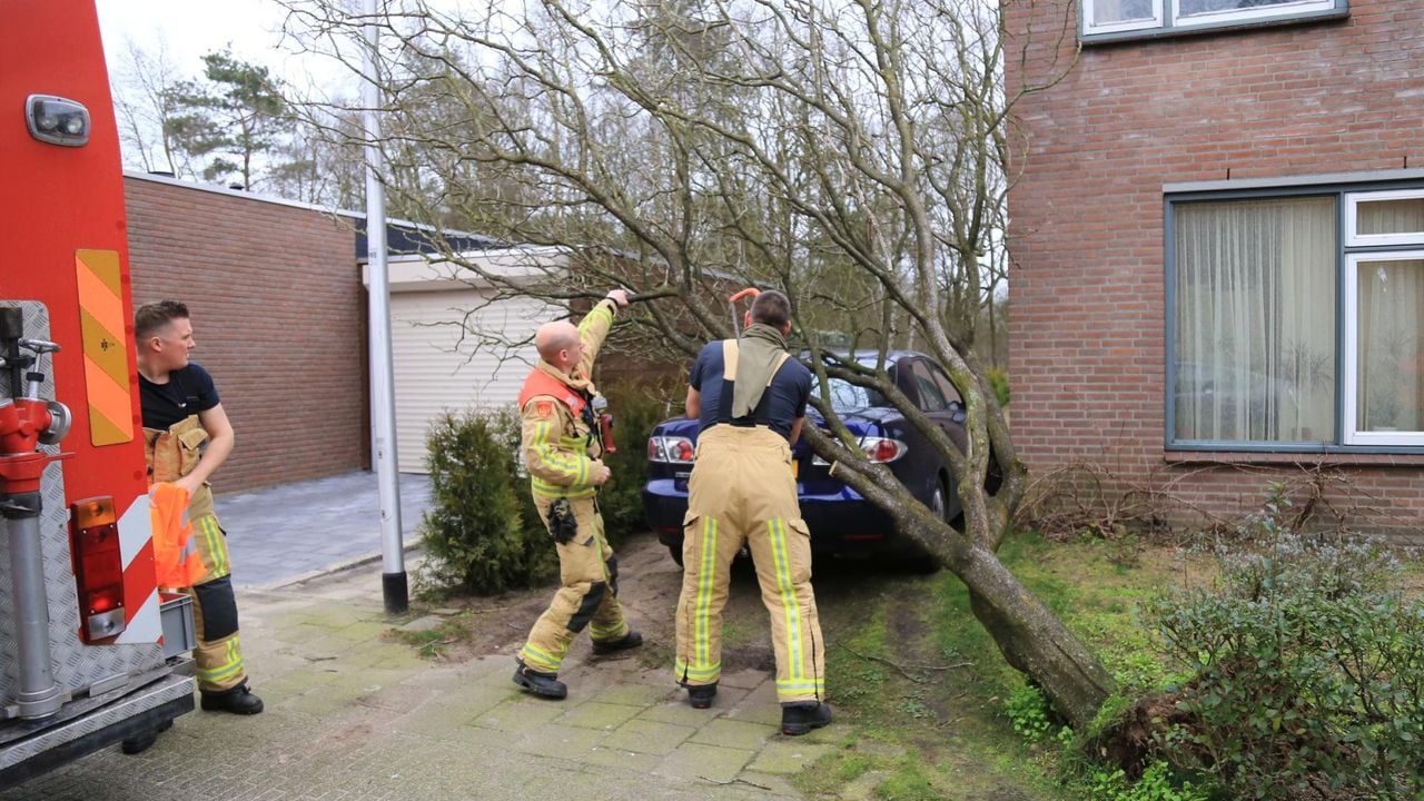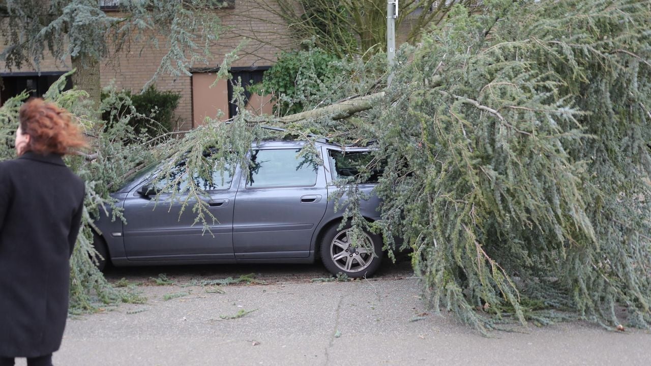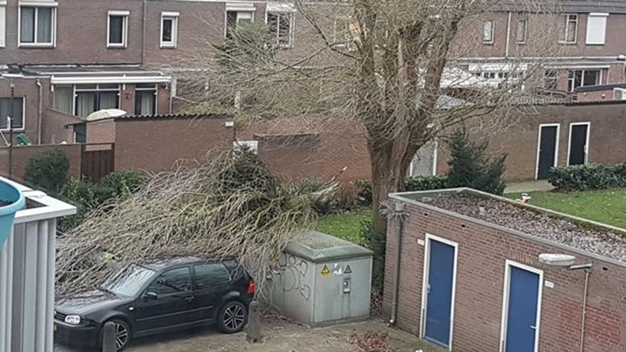 16.42 Boom waait op geparkeerde auto op de Beethovengaarde in Oss. Foto Charles Mallo