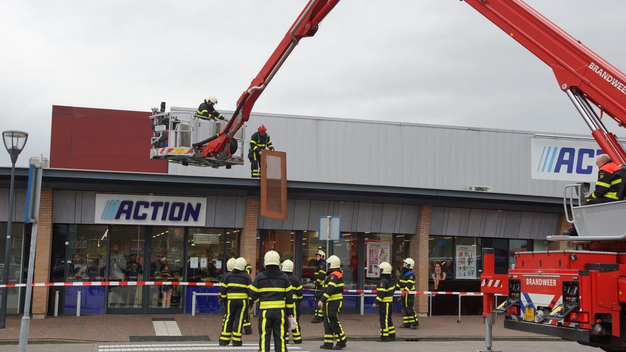15.10 De brandweer haalt in Waalwijk losse platen van het dak van de Action. Foto Erik Haverhals