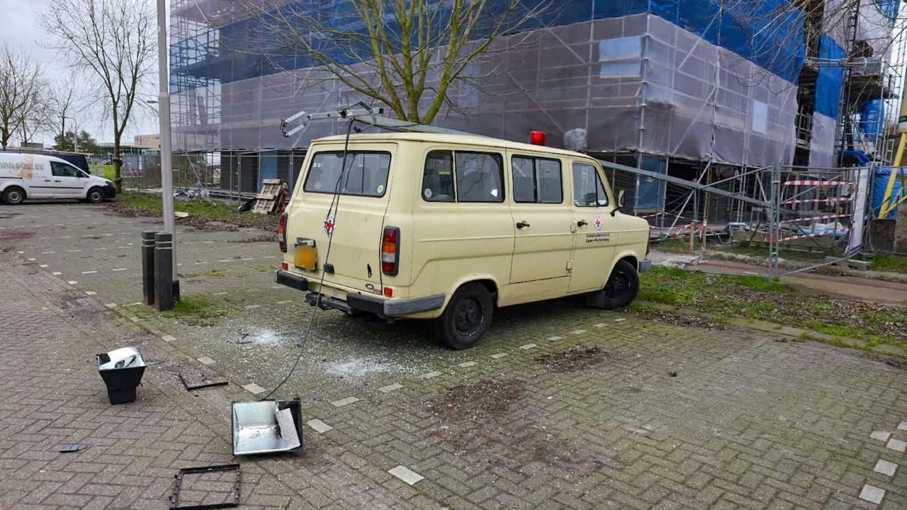 16.03 Lichtmast op bouwplaats valt precies op oude ambulance aan de Oegstgeeststraat in Tilburg. Foto Jeroen Stuve
