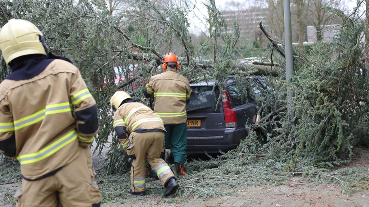 18.37 Een geparkeerde auto op de Beethovengaarde in Oss werd eerder vanmiddag door een omgewaaide boom te grazen genomen. Het voertuig raakte zwaar beschadigd.