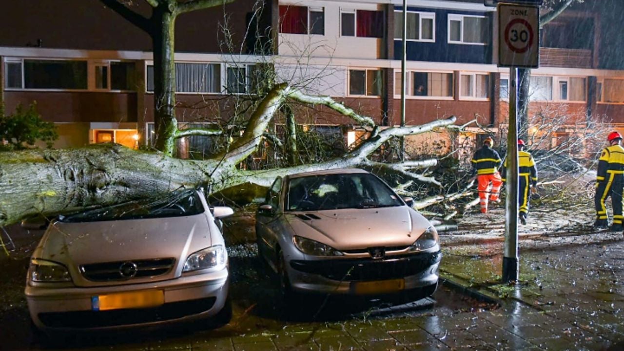 21.55 Pech voor twee autobezitters: op de Professor Gimbrèrelaan in Tilburg landde een omgewaaide boom bovenop twee geparkeerde voertuigen.