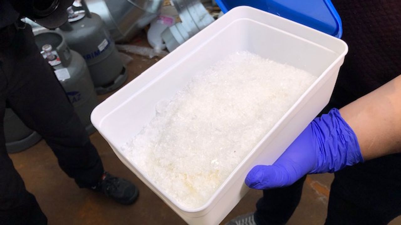 Halffabricaat in de vorm van olie en het eindproduct, crystal meth, in een diepvriesbakje met kristallen ter waarde van 60.000 euro. Grondstoffen en afvalstoffen, tot en met de bierblikjes van de laboranten aan toe met misschien wel overal dna. Technisch voer en mogelijk bewijs voor de specialisten die de verdachten moeten linken aan het lab.