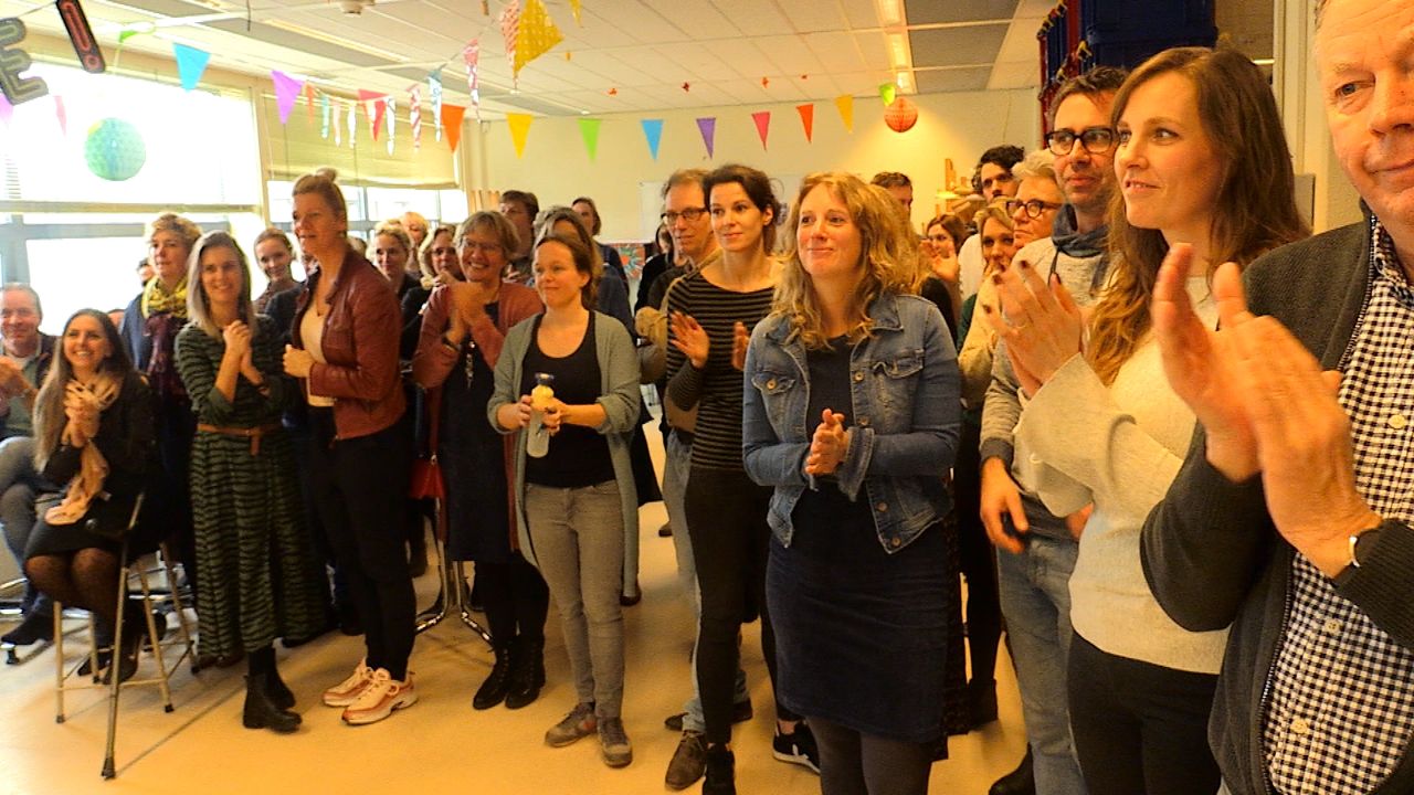 Tientallen docenten kwamen hun collega woensdag feliciteren. Er werd gezoend, geapplaudisseerd en er zijn bloemen en slagroomtaart. Al is die dan wel niet gebakken door de winnaar van Heel Holland Bakt. "Superlief, ik hoor nu voor het eerst een trilling in mijn stem. Dat komt omdat jullie de mensen zijn die in mijn hart zitten."