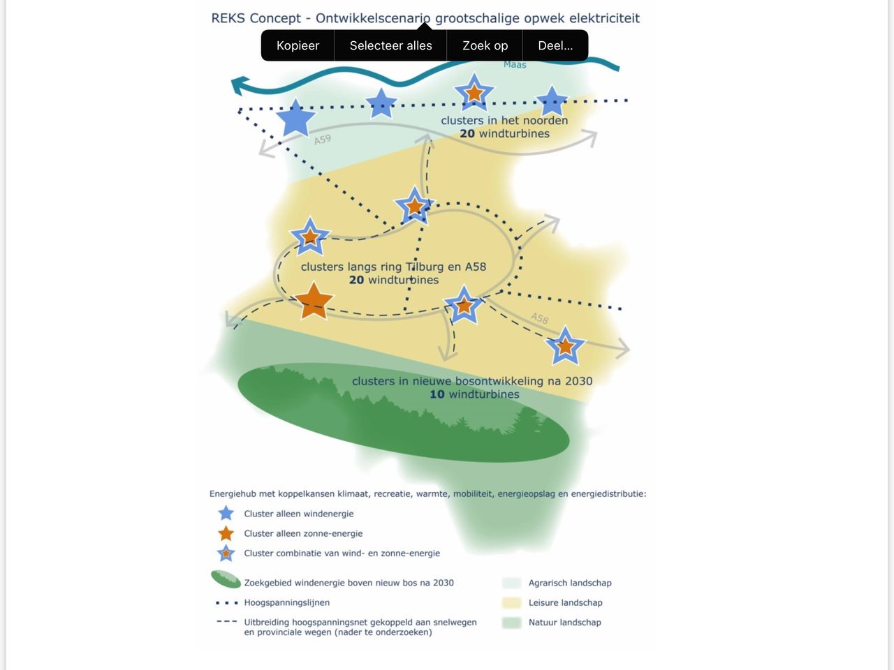 De regio Hart van Brabant heeft woensdagavond laten zien wat de beste plekken zijn om dat te doen. Voor windmolens is het landelijke gebied boven Waalwijk geschikt. Daar kunnen vier clusters komen met ieder vijf windmolens. Maar ook aan de randweg van Tilburg en langs de A58 kunnen windmolens en zonneparken komen, vaak als uitbreiding van windparken op bestaande industrieterreinen zoals Kraaiven en Vossenberg. In totaal gaat het om circa twintig molens. De A58 wordt al de Route du Soleil van Brabant genoemd.