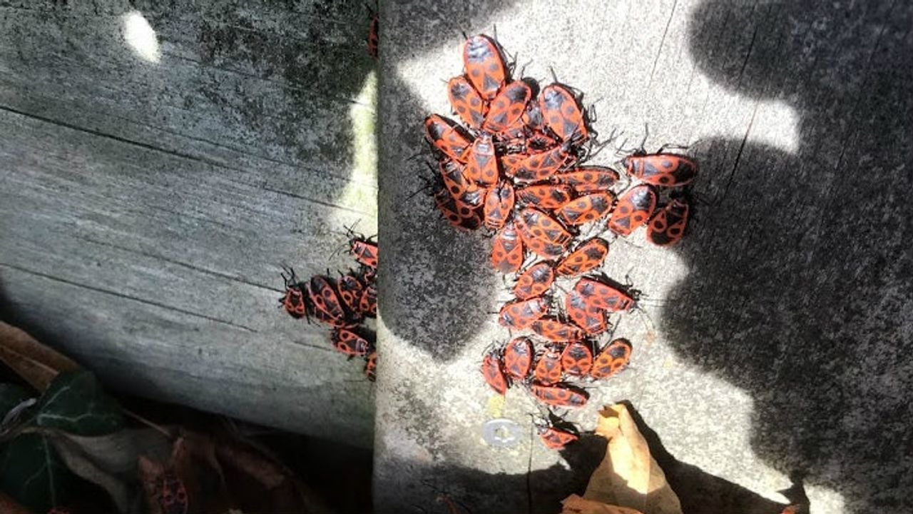 Op de foto hierboven zie je een aantal insecten bij elkaar. Ze hebben een mooie oranjerode kleur met zwarte tekeningen, waardoor hun rug lijkt op een Afrikaans masker. We hebben hier te maken met vuurwantsen. Het is bekend dat veel vuurwantsen bij elkaar zitten. Dit heeft te maken met een soort groepsbescherming. Zoals alle wantsen ondergaan ook vuurwantsen een onvolledige gedaanteverwisseling. Nadat de eitjes opengaan, komen er meteen jonge vuurwantsen uit. Die noemen we ook wel nimfen. Deze zijn altijd vleugelloos en missen daardoor de voor de vuurwants kenmerkende zwarte stippen op de vleugels. Deze jonge vuurwantsen doen er vijf stadia over om uiteindelijk een volwassen vuurwants te worden. Elke stadium vervellen deze insecten. Aangezien vuurwantsen in kolonies opereren, paren de volwassen ook in kolonies en dus worden er veel vuurwantsnimfen tegelijkertijd geboren. Overigens duurt de paring bij vuurwantsen erg lang. Een paring kan twaalf uur duren maar soms ook veel langer, tot zeven dagen! Dit komt wel meer voor bij insecten. De mannetjes blijven trouwens lang aan het vrouwtje gehecht zodat ze niet met andere mannetjes kan paren. Vuurwantsen zuigen vooral planten leeg. Als die er niet voldoende zijn, zuigen ze dode insecten leeg en soms gaan ze over tot kannibalisme.
