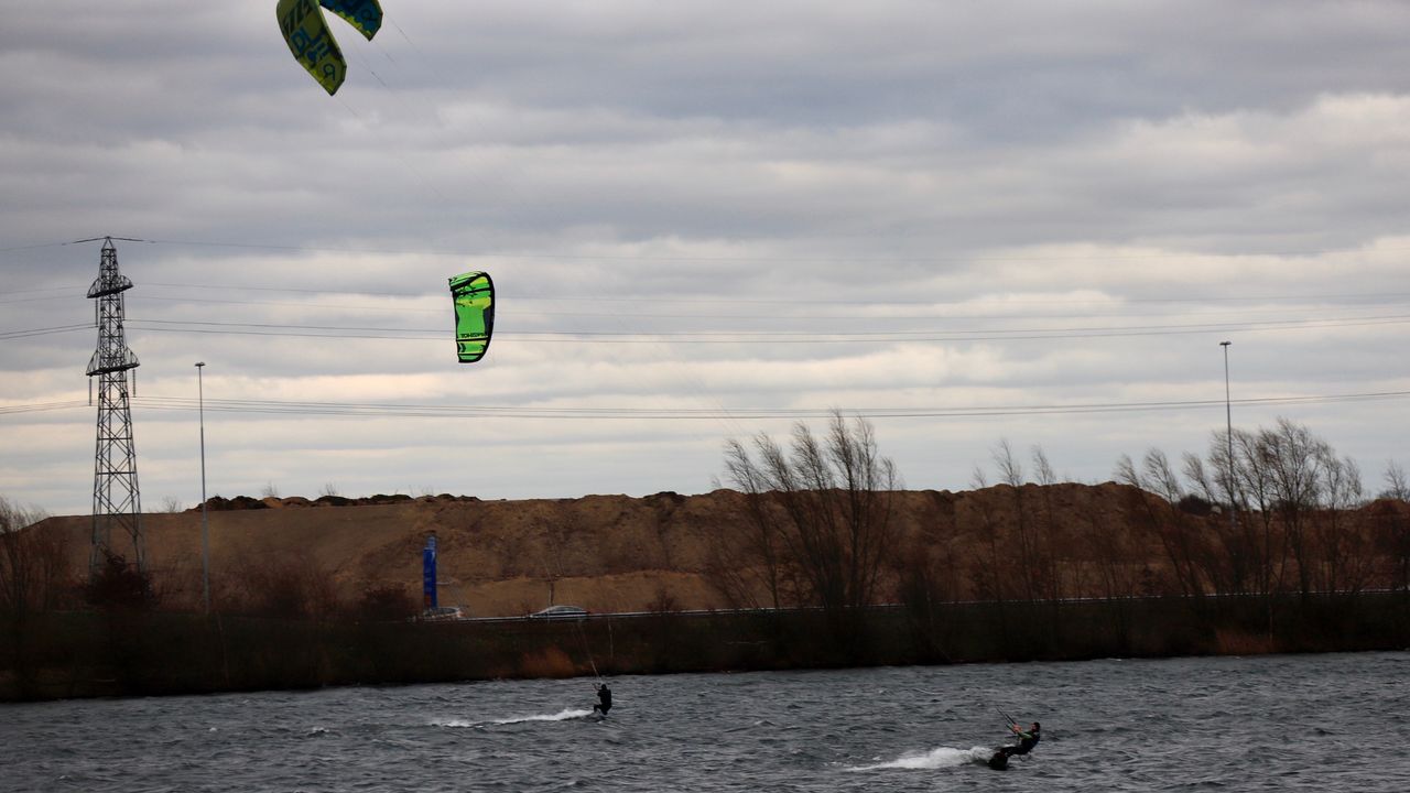 Zo maakten deze kitesurfers bij de Kraaijenbergse Plassen in Linden dankbaar gebruik van de harde wind die Storm Dennis met zich meebrengt. Met windstoten tot negentig kilometer per uur konden met name kitesurfers zondag hun hart ophalen.