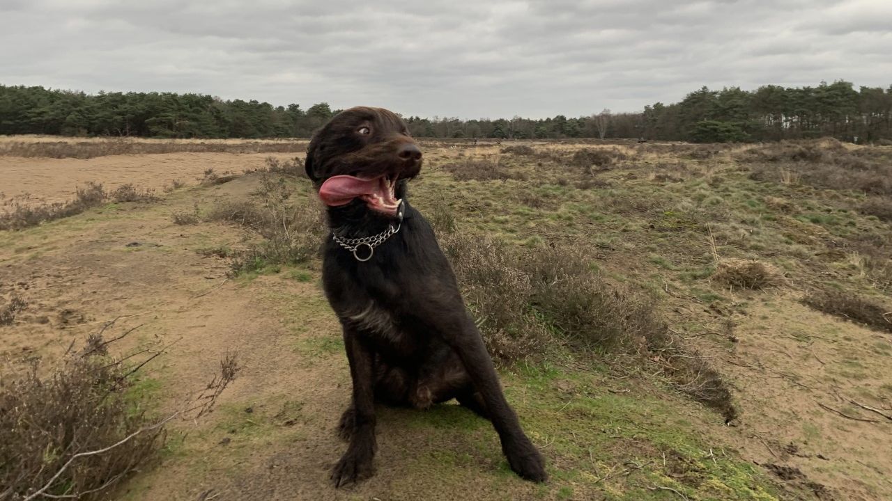 Ook deze hond op de Regte Heide bij Goirle leek weinig moeite te hebben met storm Dennis.