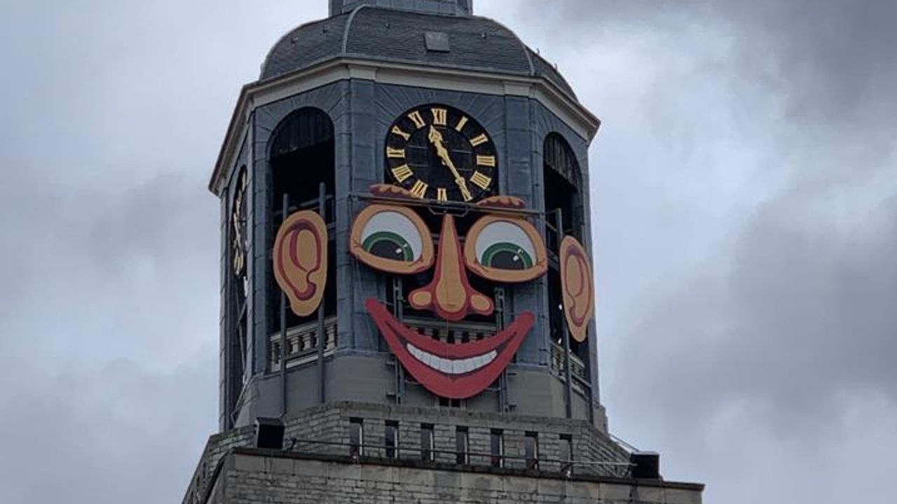 Het staartje van storm Dennis gooide de afgelopen dagen flink roet in het eten. Tevergeefs werd geprobeerd het middelpunt van het Bergse volksfeest helemaal aan te kleden. Pas woensdag lukte het om met een grote kraan het gezicht naar boven te hijsen. De poging om de kerktoren te voorzien van de bekende blauwe kiel en lange armen moest worden gestaakt.