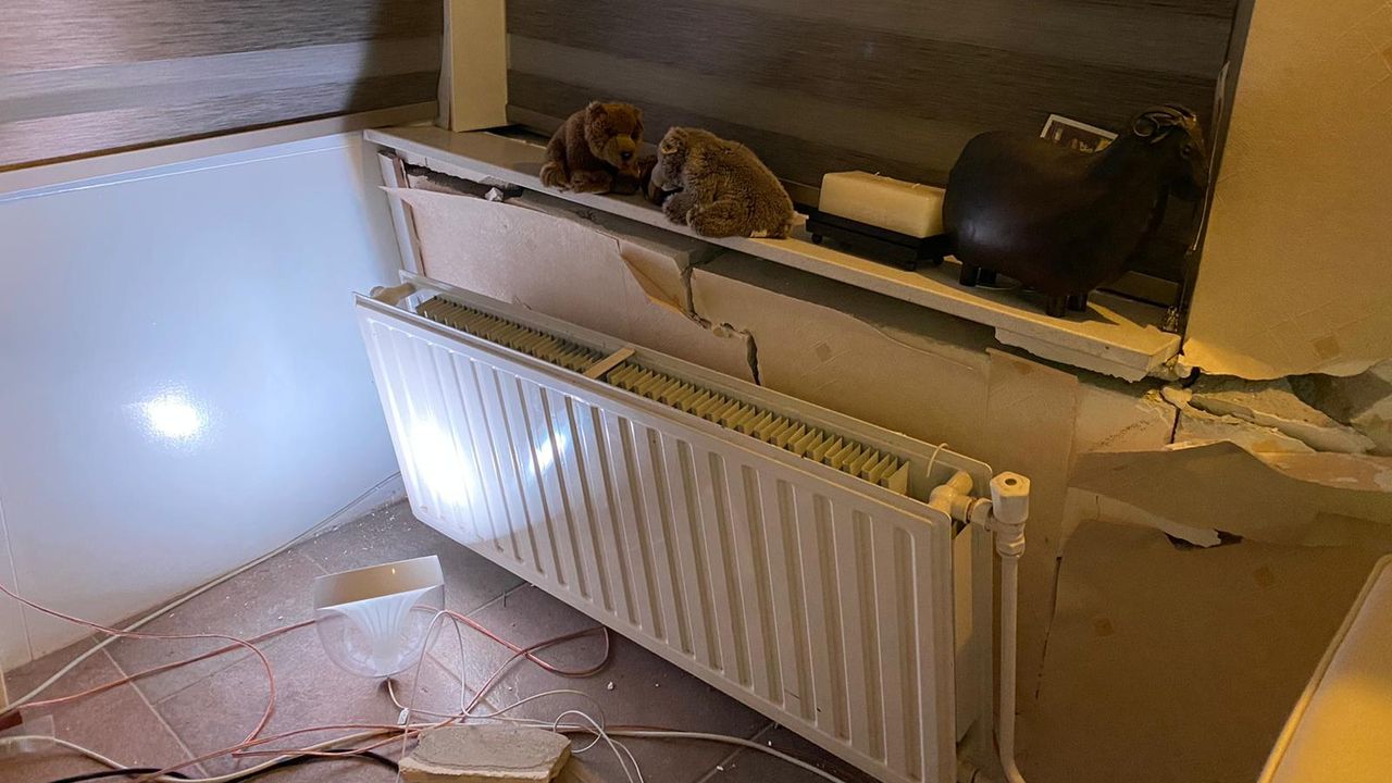 Een grijze Renault was door de voortuin gereden en kwam tegen de gevel tot stilstand. De muur van het huis zit vol scheuren. "De gevel komt zo'n 25 centimeter naar binnen. Het is echt bizar", vervolgt de bewoner. Ook zit een radiator niet meer op zijn plek.