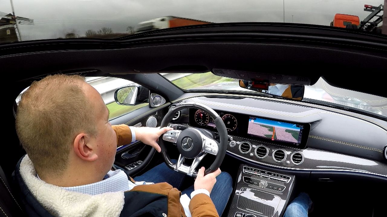 Het grommende geluid van de acht cilinders overstemd buiten alles wat er gezegd wordt dus doen we het interview in de auto. Thierry neemt plaats achter het stuur. Schijnbaar onbewogen duwt hij het gaspedaal langzaam naar beneden. Eenmaal op de snelweg is er alleen nog een brede lach van oor tot oor. “Wow heerlijk, dit geluid. Dit zijn de betere wagens hoor.”