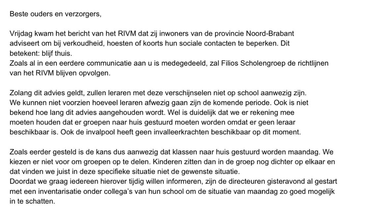 "We kunnen niet voorzien hoeveel leraren afwezig gaan zijn de komende periode. Ook is niet bekend hoe lang dit advies aangehouden wordt. Wel is duidelijk dat we er rekening mee moeten houden dat we groepen naar huis moeten sturen omdat er geen leraar beschikbaar is. Ook de invalpool heeft geen leerkrachten beschikbaar op dit moment", staat in de brief die Kerkhof naar alle ouders van de veertien scholen heeft verstuurd.