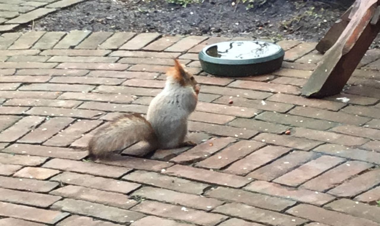Op de foto van Astrid van der Steen zie je een eekhoorn met een overwegend grijs lichaam. Ook de staart is grijs gekleurd. Enkel een stukje van de kop en de oortjes zijn roodbruin. Toch hebben we hier te maken met de gewone of rode eekhoorn. Dit is officieel de enige eekhoorn in Nederland. Waarom deze eekhoorn niet de normaal roodbruine kleur heeft, heeft te maken dat hij of zij nog een winterkleed draagt. Het winterkleed va onze eekhoorns kan variëren van grijs tot bijna zwart. De eekhoorn van Astrid van der Steen is wel erg grijs geworden, maar de kleur komt al terug. Dit kun je zien aan de pluimpjes op de kop en een stukje van de kop. Die beginnen al roodbruin te worden en de pluimpjes zijn weer terug, want die verliezen ze in de winter.