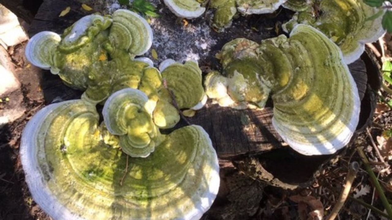 Op de foto hierboven zie je op de stomp van een stam een aantal zwammen. Die hebben een groene kleur, maar de randen zijn wit. De groene kleur is een soort aanslag doordat ze in de schaduw staan. Normaal gezien zijn deze zwammen helemaal wit. Het zijn witte bultzwammen. Deze zwammen groeien het meest op oude stammen van beukenbomen. Daar leven ze van de afbraak van het dode hout. Witte bultzwammen zijn in vochtige toestand stevig en taai, maar in droge toestand worden ze keihard. Het zijn dan ook duidelijk niet eetbare zwammen.