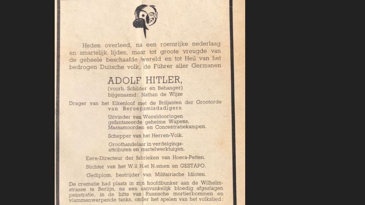 Verderop in het oosten woedt de oorlog volop. Diep onder de grond bij de rijkskanselarij in Berlijn neemt Hitler afscheid van zijn vertrouwelingen. Zijn hond krijgt een gifpil. Eva Braun ook. Tot slot neemt hij zelf ook een pil. Hij zet een pistool tegen zijn hoofd en schiet. De Führer is dood. ‘Gesneuveld in de strijd', melden de Duitse media. Maar de oorlog gaat verder.