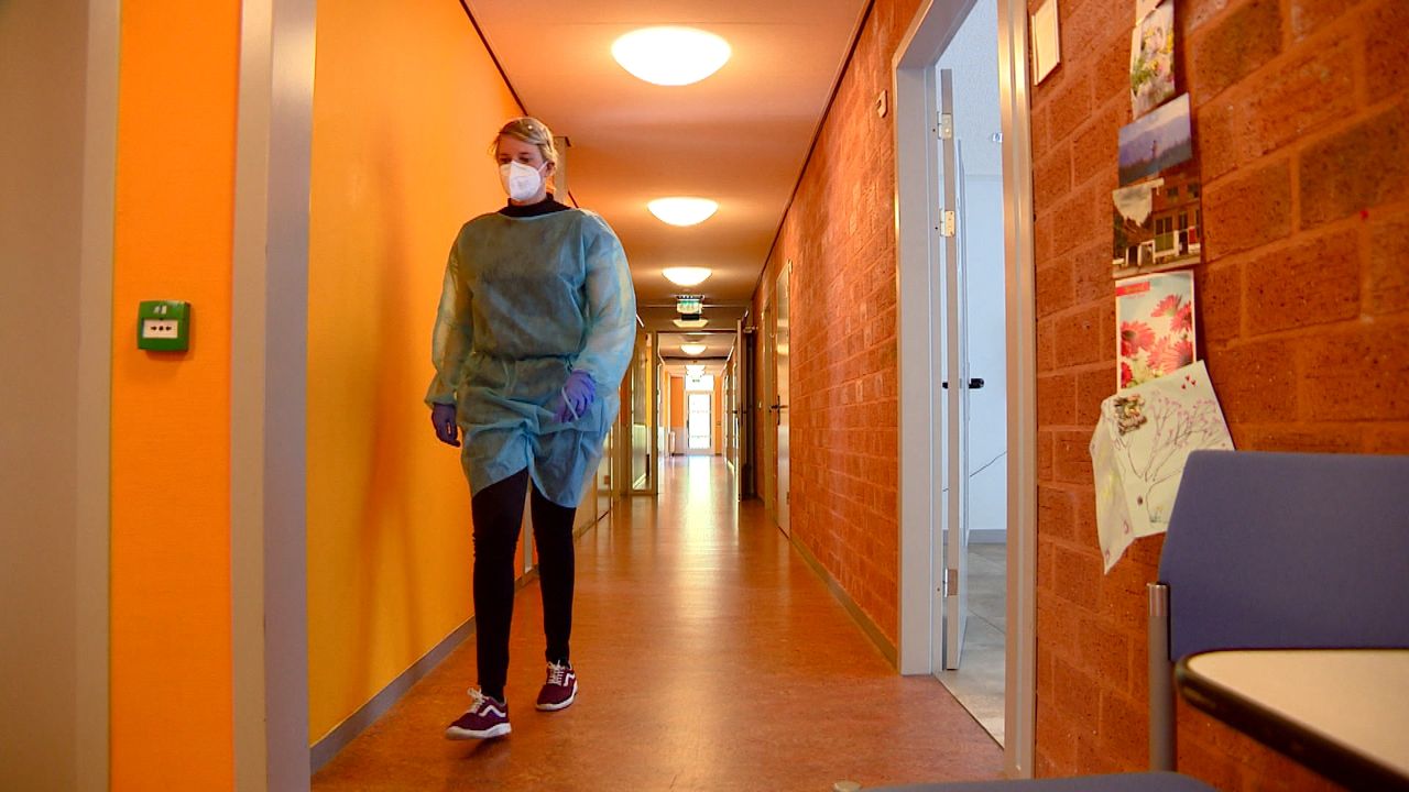 Evi van Esch is verpleegkundige van het eerste uur op deze corona-afdeling. Toen personeel gevraagd werd bij te springen, meldde zij zich direct. Spannend en leuk, noemt ze het werk. Een mondkapje bedekt haar gelaat, alleen haar blonde lokken en blauwe ogen zijn zichtbaar. Bewoners reageren wisselend.