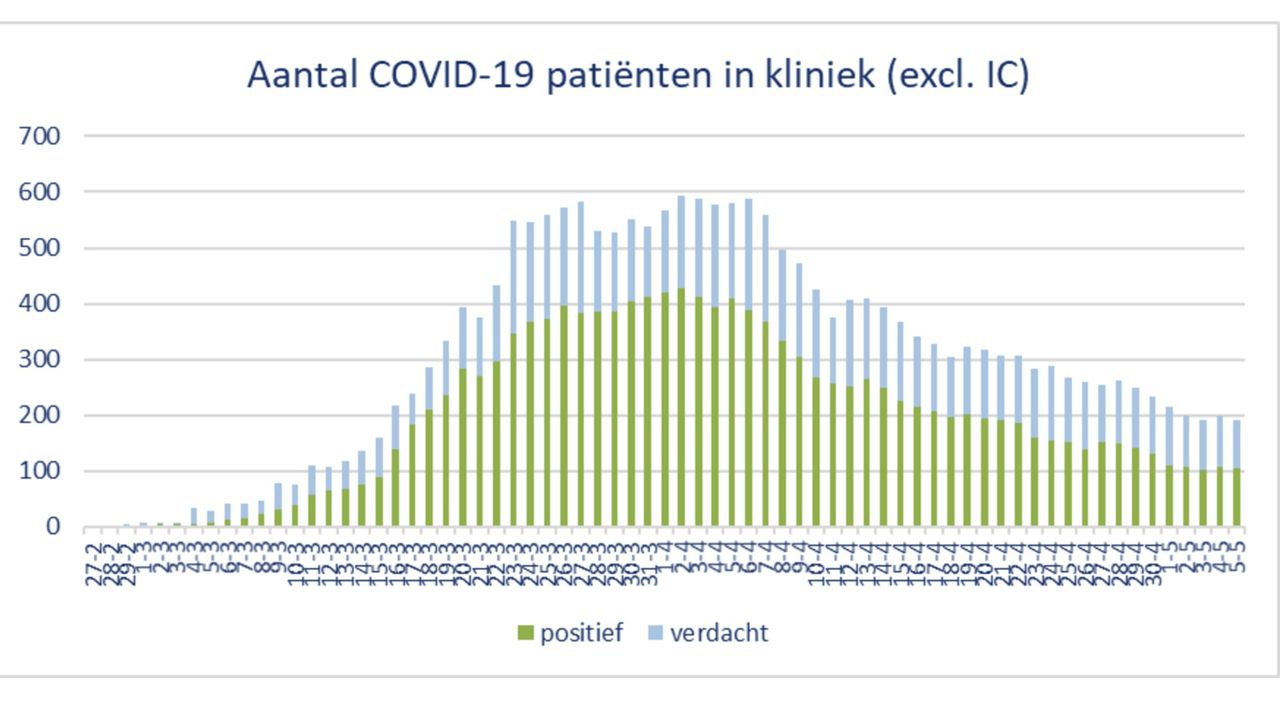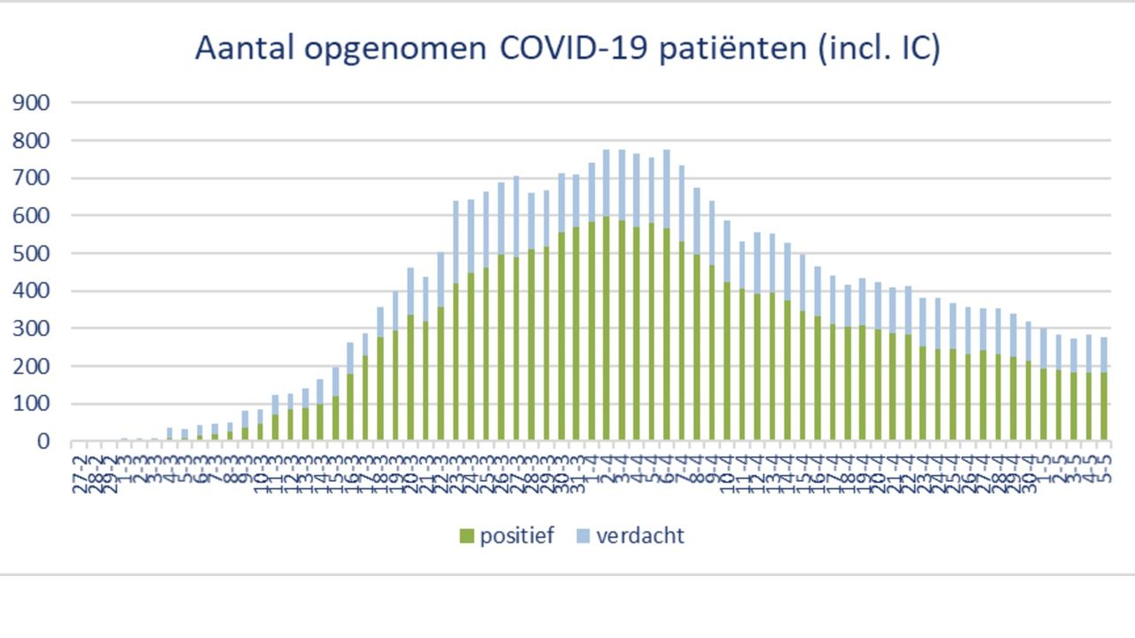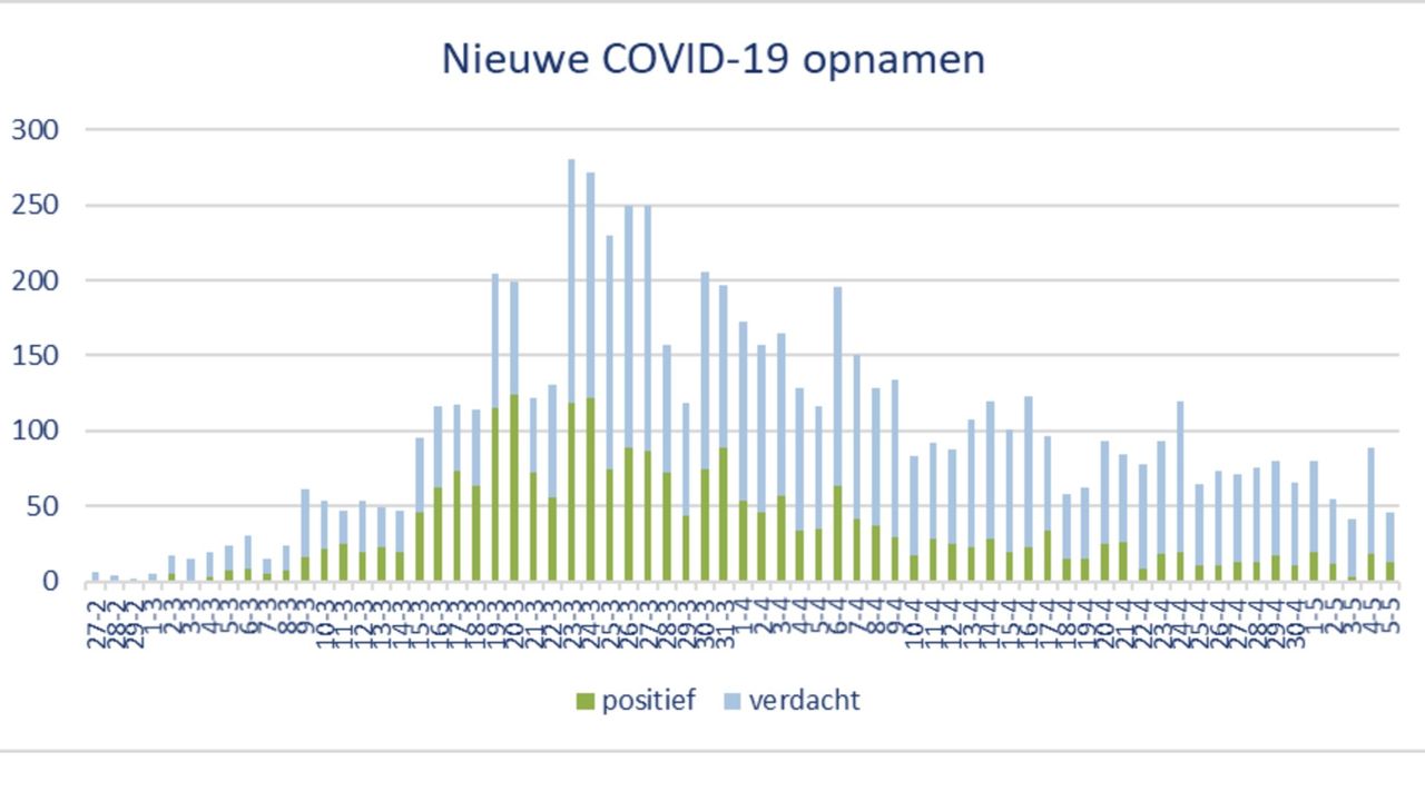 Het aantal nieuwe besmettingen, opnames en sterfgevallen ligt aanzienlijk lager dan op het hoogtepunt van de coronacrisis, eind maart en begin april. Op 24 maart werd aan de GGD'en gemeld dat 580 mensen in ziekenhuizen werden opgenomen. Op 27 maart waren dat er 569. Sinds 18 april is het aantal gemelde opnames niet meer boven de honderd uitgekomen. Op 31 maart stierven 174 mensen, op 2 april 172. Sinds 30 april blijft het aantal doden per dag onder de vijftig.