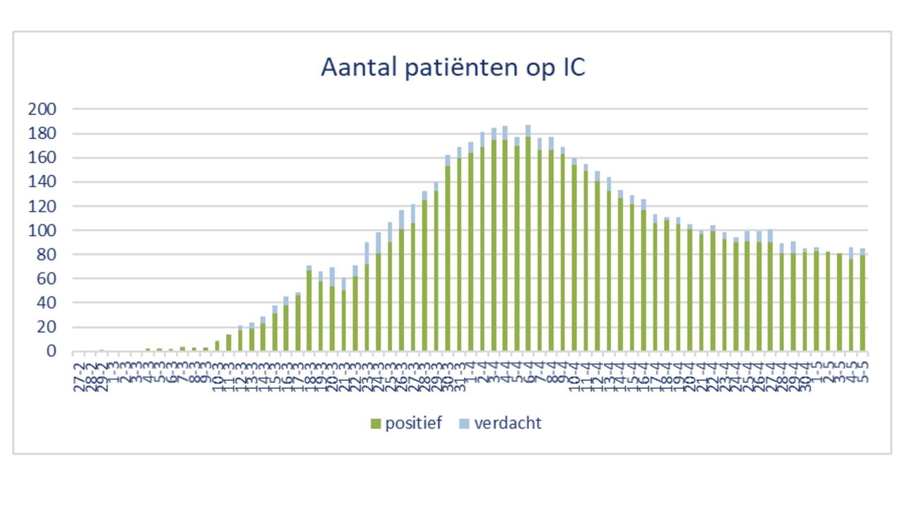Op de intensive care liggen in totaal 85 coronapatiënten. Daarvan hebben er 79 zeker het coronavirus, 6 vertonen verdachte verschijnselen. Een dag eerder waren dat 86 coronapatiënten.