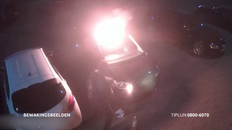 De politie laat beelden zien van hoe de brandstichter vloeistof over de auto giet en hem vervolgens met hulp van een doordrenkte doek in brand steekt.