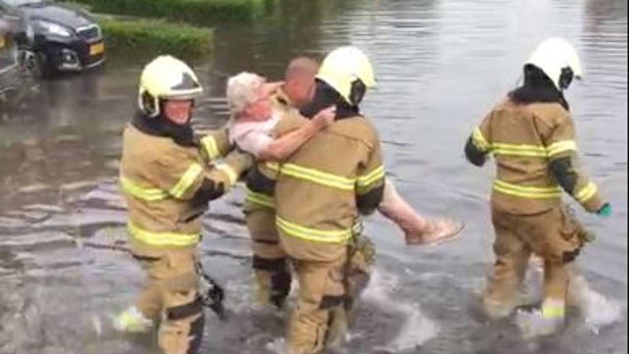 De sterke hulpverleners tilden oma Annie uit de bijrijdersstoel en droegen haar naar de voordeur van haar huis, waar ze met droge voeten naar binnen kon. "Ze kan de deur inmiddels weer uit, want het water is gezakt."