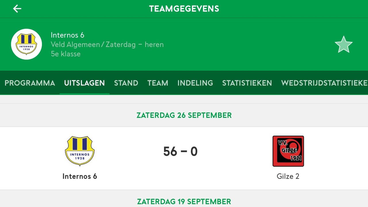 Iemand met dikke vingers heeft de uitslag ingetypt en de 5 en de 6 aan elkaar getikt in plaats van allebei op de goeie plek. Dus de mannen van het zesde hebben niet met ongelooflijke cijfers gewonnen, maar zelfs verloren. Voordeel: het was vast een stuk spannender dan bij een uitslag van 56-0.