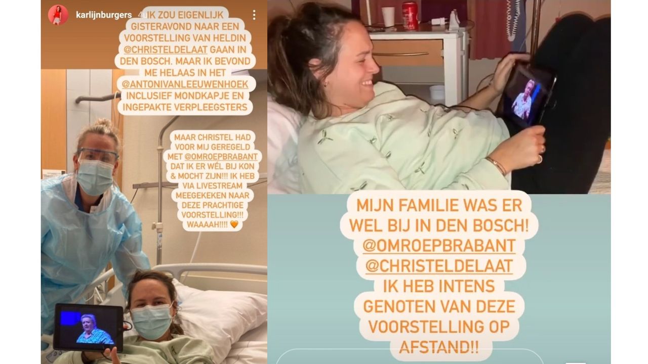 De cabaretière liet het er niet bij zitten en regelde een live videoverbinding met het Antoni van Leeuwenhoekziekenhuis in Amsterdam. Vanuit haar ziekenhuisbed keek Karlijn samen met haar man mee met de show, zodat ze er toch een beetje bij kon zijn.