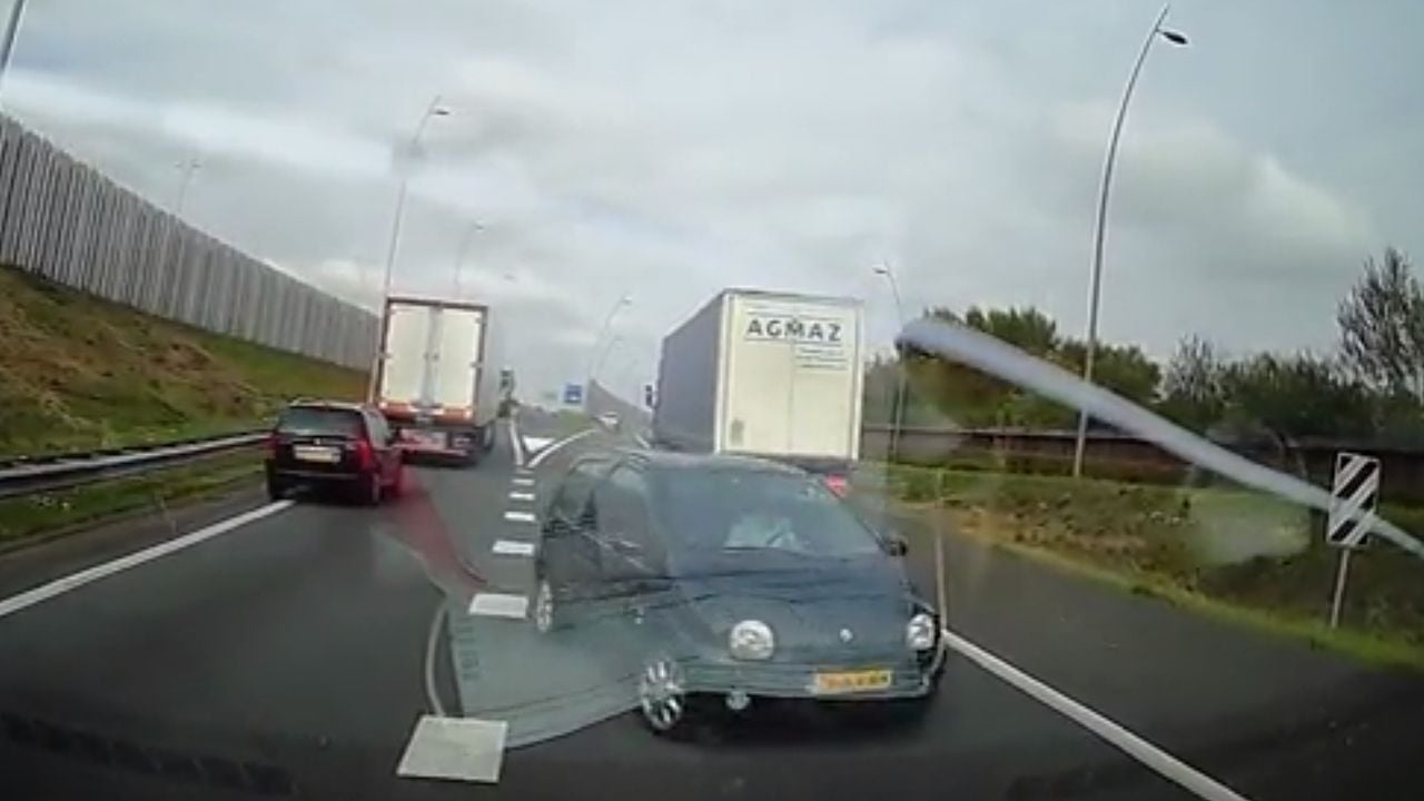 Op videosite Dumpert zijn de beelden te zien van deze levensgevaarlijke actie. De Twingo rijdt op een plek waar het verkeer vanaf de A67 moet kiezen tussen de richting A2 Den Bosch/Tilburg en N2 Veldhoven/Eindhoven.