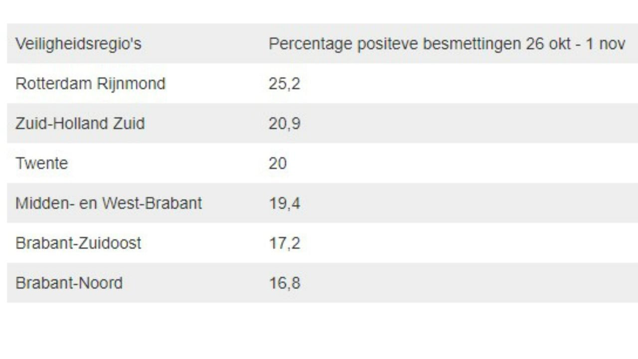 De drie regio's die Rutte noemde, hebben de hoogste percentages positieve testen (boven de 20 procent). In Midden- en West-Brabant ligt dat percentage met 19,4 procent nog net onder die grens en ligt landelijk gezien op de vierde plek en dat betekent dat bijna 1 op de 5 afgenomen tests positief is. De andere twee Brabantse regio's (Noord en Zuidoost) staan er met 16,8 en 17,2 procent iets rooskleuriger voor.