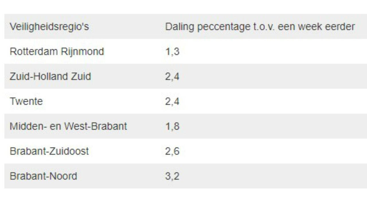 Midden- en West-Brabant kent ook een tragere afname (1,8 procent) dan de rest van het land. Alleen in de regio Rotterdam Rijnmond nemen de nieuwe besmettingen langzamer af (1,3 procent). In Brabant-Noord was het verschil 3,2 procent en in Zuidoost 2,6 procent ten opzichte van een week eerder.