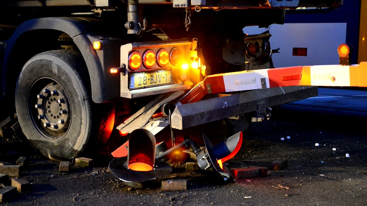 De vrachtwagen heeft na de botsing ook een spoorboom geraakt en er is veel olie gelekt op het wegdek. Er lagen ook veel brokstukken op de weg.