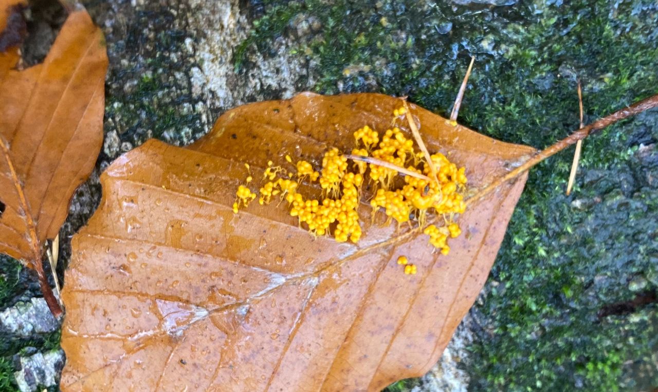 Op de foto die Jules Andela naar mij stuurde, zie dat je op mos een soort geelbruine eitjesachtige vormen. Naar mijn idee zijn dit echter geen eitjes en ook geen paddenstoelen, maar een myxomyceet ofwel slijmzwam met de naam 'glanzend druivenpitje'. Ik heb er een foto van mijzelf bij gedaan waarop ook de steeltjes van dit glanzend druivenpitje te zien zijn. Deze slijmzwam kun je tegenkomen op dood blad, op mossen en op afgevallen takjes. Daarnaast - maar dan op enkele centimeters boven de grond - op levende kruiden en stammetjes van bomen.