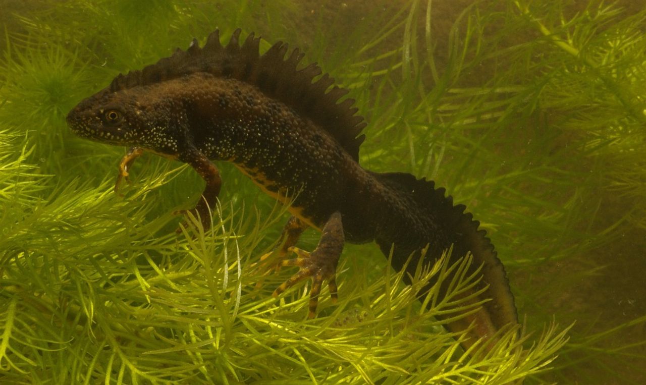 Op de foto van José Diks is een zwart dier afgebeeld met over het lichaam vele kleine witte puntjes en op de poten zie je gele nagels. We hebben hier dan ook te maken met de landvorm van de kamsalamander. Vermoedelijk is dit diertje verstoord in zijn winterslaap en is op zoek naar een nieuwe verblijfplaats. We kunnen de onderkant van de buik niet zien, maar die is mooi oranje met zwarte vlekken. Dit zowel in de landvorm als in het water.