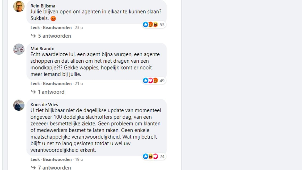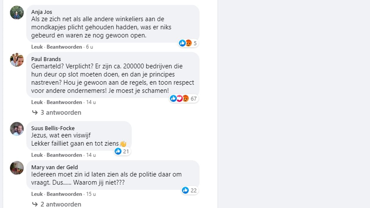 Op de Facebookpagina van de winkel, stond al sinds december dat bezoekers echt geen mondmasker hoeven te dragen. Sinds de sluiting dit weekend, regent het ook onder dat bericht reacties. “Raad iedereen aan hier nooit meer te kopen”, schrijft Gert. En Mariseva zegt: “Had gewoon ’t goede voorbeeld gegeven door een mondkapje te dragen. Al is het maar voor de mensen in de zorg!”