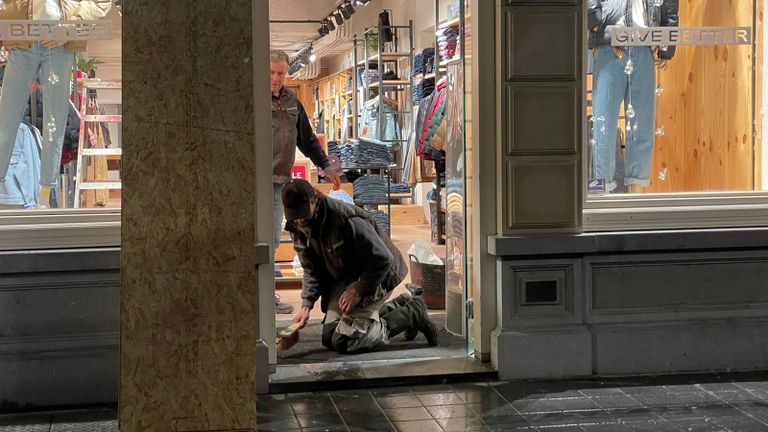 Even verderop een schoenenwinkel, een modezaak, een brillenzaak. Overal zijn ruiten kapot en zie je andere sporen van vernieling. Een troosteloos beeld van kapotte ramen en dichtgetimmerde panden.
