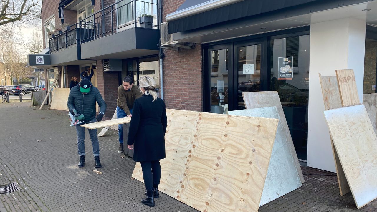 Even verderop is Quinten Rebergen druk in de weer met een schroefmachine om platen tegen zijn fourniturenwinkel te schroeven. "Ik vind het heel vervelend dat wij deze maatregelen moeten nemen voor een paar raddraaiers. Belachelijk", reageert hij.