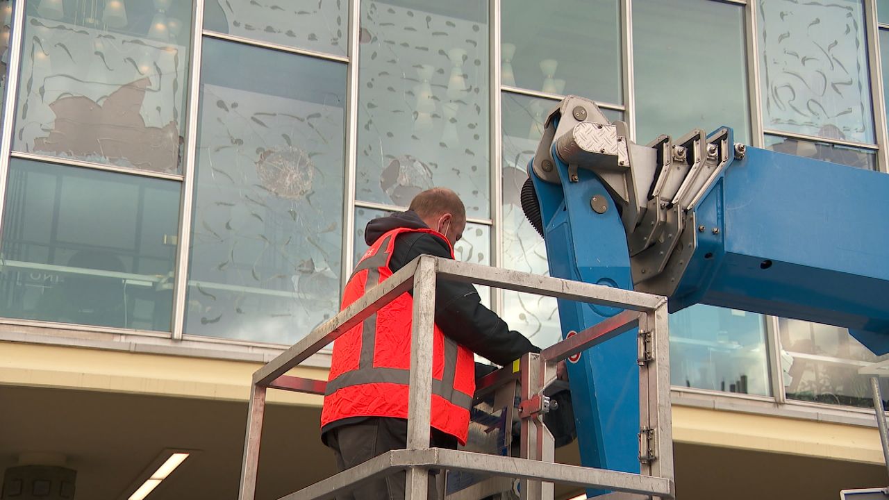 Bij de Jumbo City op Eindhoven Centraal bedekken houten planken de gebroken ruiten van de kleine supermarkt. Ook aan het monumentale stationsgebouw moet nog een hoop gebeuren. Een groep glaszetters is vrijdagmiddag bezig om de boel op te meten. ''In de ramen zat speciaal glas en alles moet ook nog op maat gemaakt worden", vertelt een van de mannen. "Dat kost erg veel tijd en kan zomaar nog eens acht weken duren."