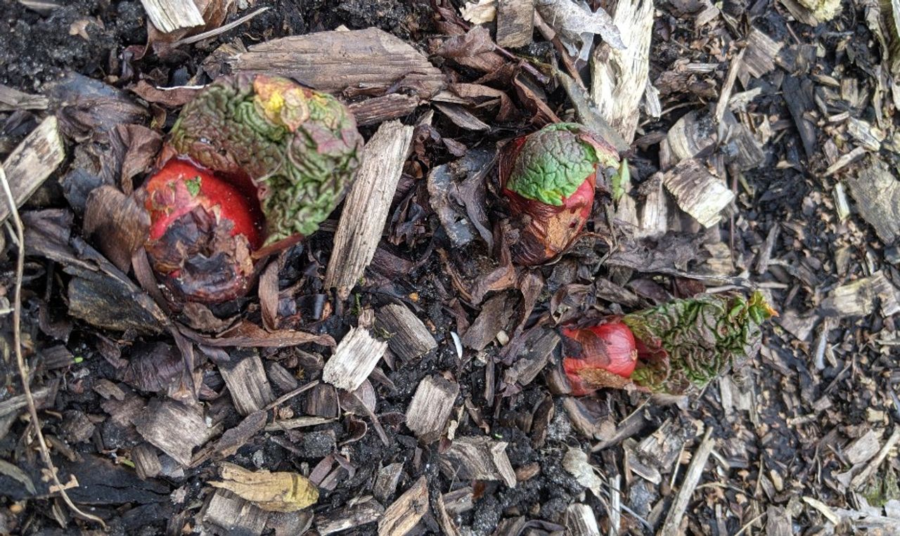 Mevrouw De Vries uit Gemert vond ze lijken op bijna uitkomende rabarber. "Je ziet dan eerst die glanzende bollen, waarna zich het blad ontvouwt." Intussen zijn de raadselachtige bollen doorgegroeid en heeft Jeroen van der Meulen doorgegeven dat het inderdaad rabarber is. "Een dit had ik kunnen weten, want die is daar vorig jaar geplant.