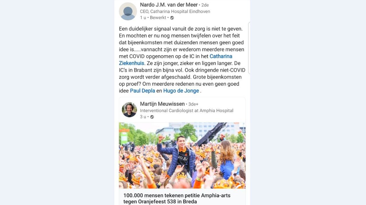 "Een duidelijker signaal vanuit de zorg is niet te geven", reageert Nardo van der Meer, voorzitter van de raad van bestuur van het Catharina Ziekenhuis in Eindhoven, op de enorme steun voor de petitie. "Grote bijeenkomsten op proef? Om meerdere redenen nu even geen goed idee", zegt hij.