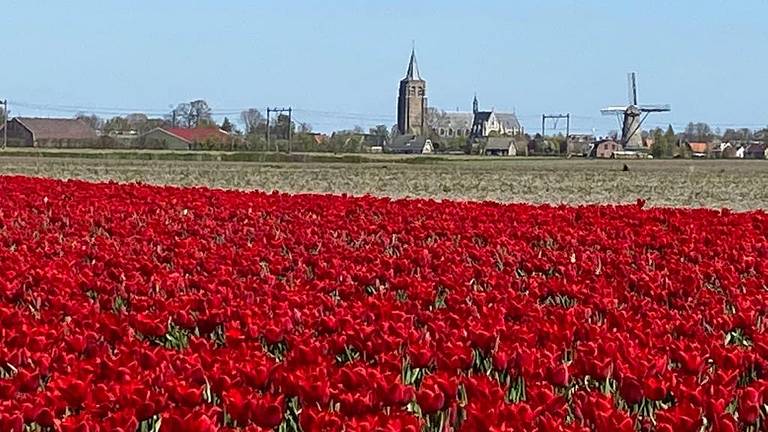 De tulpen zijn van een bollenkweker uit Moerstraten. Vorig jaar bloeiden de bloemen aan de andere kant van de snelweg. Het veld was toen een ware attractie voor toeristen. Mensen maakten er een uitje van om elkaar tussen de tulpen te fotograferen. En al was plukken verboden, sommigen waagden zich er toch aan.