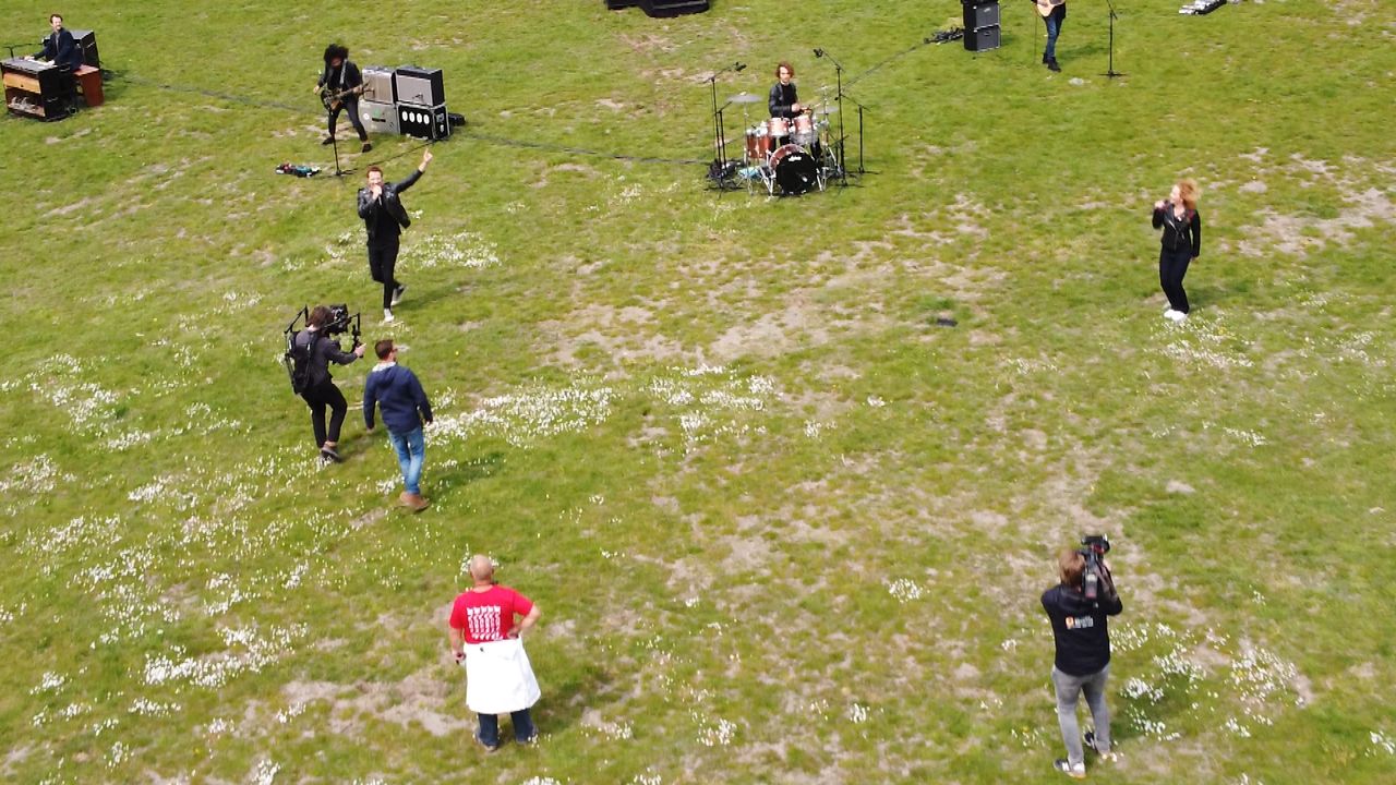 "Ik ben blij dat we weer eens keer buiten mogen spelen", zegt Bjorn van de Doelen lachend als hij het grote lege veld op loopt. Dit is het terrein waar normaal duizenden mensen bij elkaar komen om op 5 mei de vrijheid te vieren. Midden op het veld staan een drumstel, een orgel een wat gitaarversterkers. Als decor brandt er de vrijheidsvlam, die ook tijdens het Bevrijdingsfestival zou branden, maar verder is het leeg. Verschillende cameramensen rennen op het grote veld heen en weer.