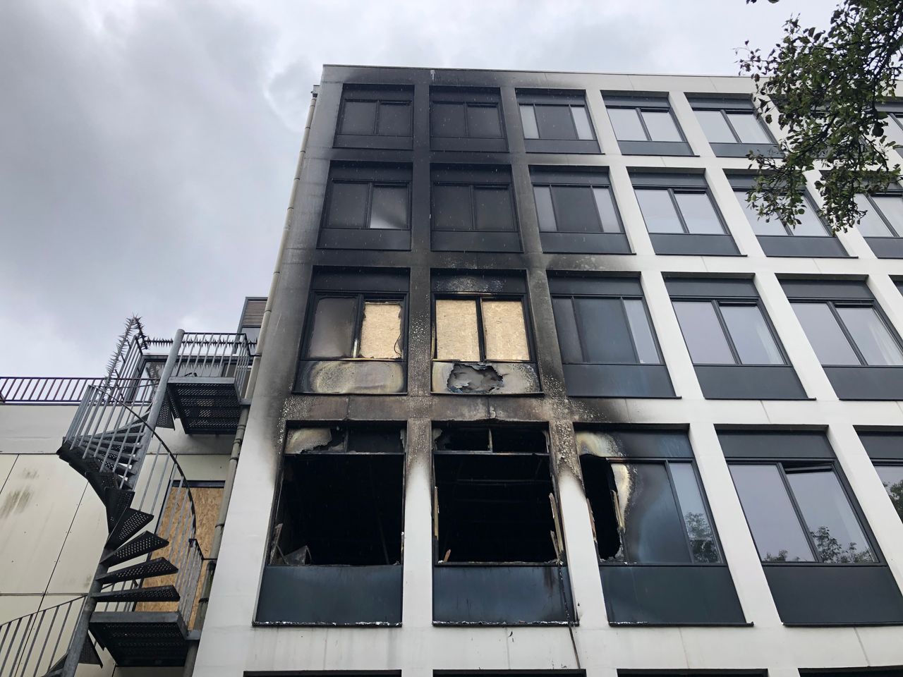 Lotte loopt rond het zwartgeblakerde appartementencomplex. Hoopvol kijkt ze rond. "Misschien zitten ze hier nog ergens."