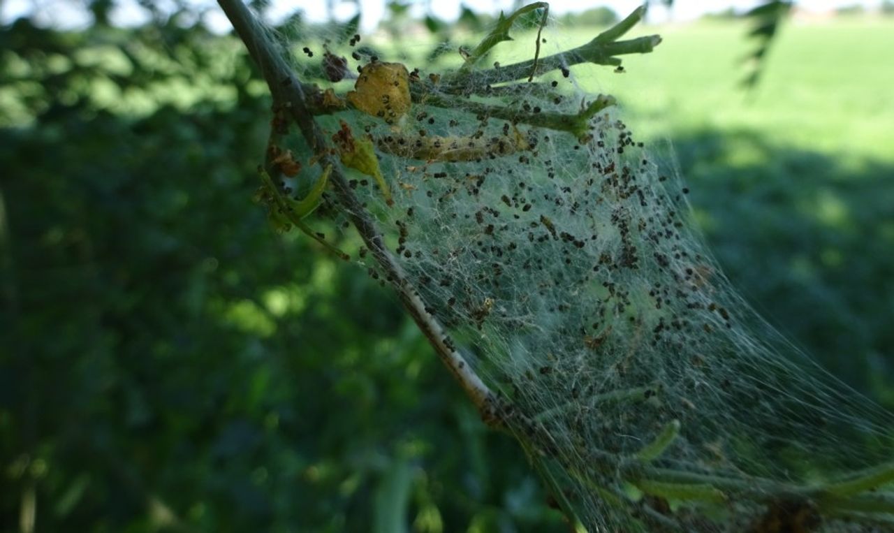 Op de bovenstaande foto van Ton van Dongen zie een groot gesponnen nest in de lijsterbes met duidelijk zichtbaar een rups in dat nest. Ton vraagt zich af of dit een eikenprocessierups is, maar dat is het niet. Ten eerste bevinden deze rupsen zich altijd in eikenbomen, zijn ze altijd heel veel bij elkaar en hebben eikenprocessierupsen lange haren op hun lichaam. We hebben hier te maken met de vogelkers-spinselmot. Dit insect moet je gewoon zijn gang laten gaan. Ze maken zo'n enorm nest om vogels af te schrikken. In het nest eten de rupsen hun magen vol. Daarna gaan ze verpoppen. Als dit popstadium aanbreekt, gaat de lijsterbes weer mooi nieuwe bladeren aanmaken. De natuur in dit geval dus gewoon haar gang laten en de kleinkinderen er lekker laten spelen en hen uitleggen wat er aan de hand is.